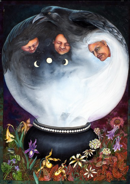 Crone, Mother, Maiden, a 40×30 watercolor by Helen Klebesadel. Smaller giclee prints of the painting, and Helen’s other work, can be found here: http://www.niceharpy.etsy.com