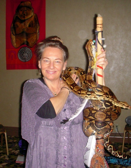 Another conference highlight was Serpentessa. Her dance with her ‘serpents’ on Saturday night was truly profound and sacred. How wonderful to see a woman moving in intimate communion with snakes. So much ancient art came alive before my eyes! In her workshop, 15 women had communion time with her wondrous snakes. I am familiar with snake iconography around the world, the pervasiveness of snake imagery in association with priestesses and goddesses, and layers of symbolic resonance in that. But what was missing for me was any sense of what that might be experientially. Serpentessa is so beautifully attuned to her snakes and very skilled at creating ritual space. A huge, huge portion of the historical record came into direct experiential bodily focus for me through that experience.