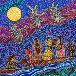 We are grateful to Métis artist Leah Marie Dorion for sharing her artwork “Passing Water Forward” for our ASWM event. Leah is a Métis writer and artist currently living near Prince Albert, Saskatchewan, Canada. Her artwork celebrates the strength and resilience of Indigenous women and families. She has also authored books forMétis children and illustrated other books on Métis culture. See more about Leah and her work here.