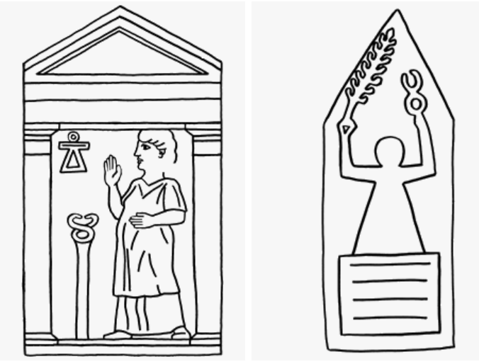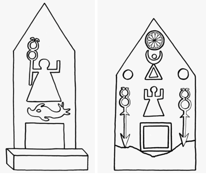 (left) Stela from Lillibeum in Sicily, depicting a worshiper or priestess revering a “caduceus” with a “sign of Tanit” hovering in the top left-hand corner. As Stéphane Beaulieu pointed out, the woman appears to be pregnant. She might be praying to Tanit for a successful delivery.