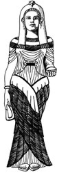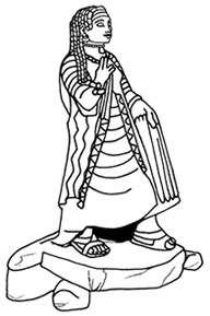 Tanit, with a pill-box crown, the “polos.” She is dressed in a robe in the Greek style. Her jewelry consists of a glass-paste necklace with graduated beads, and gold earrings. Her arms are in what was probably a “blessing” position, and they have some limited movement. A number of other figurines like this came from Ibiza. Terracotta. Half life-size. Fifth-fourth century BCE. Found in the Punic graveyard of Puig des Molins, Ibiza, Spain (The Phoenicians settled in Spain around 650 BCE.) Archaeological Museum, Barcelona.