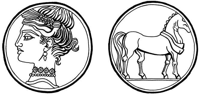 Head of goddess Tanit on coin from Carthage, her city. Such coins often had a war (?) horse on one side. Tanit’s elaborate coiffure is held in place by a band of what looks like plaited grain. She wears earrings and two necklaces. Coin probably produced during the Second Punic War, 218-202 BCE, when Carthaginian general Hannibal crossed the Alps and invaded Italy. British Museum. Electrum. 14 mm in diameter, 2.76 g in weight.