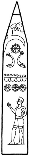 (left) Punic stela from Cirta (Constantine), which lay west of and inland from Carthage in North Africa. A stylized human-shaped “sign of Tanit” stands above a dolphin, Greek symbol of maternity. One arm bears a “caduceus.” Below the dolphin an inscription fills a rectangular space. No earlier than the third century BCE.