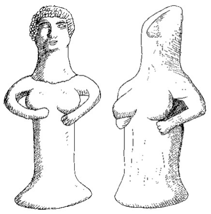 (Right) Female figure with pillar-like skirt, pinched head, and arms under breasts. The whole figure was hand made, perhaps by a worshiper for her own use. Clay. Dated about ninth century BCE. Found in Israel.