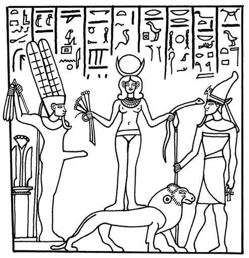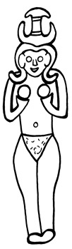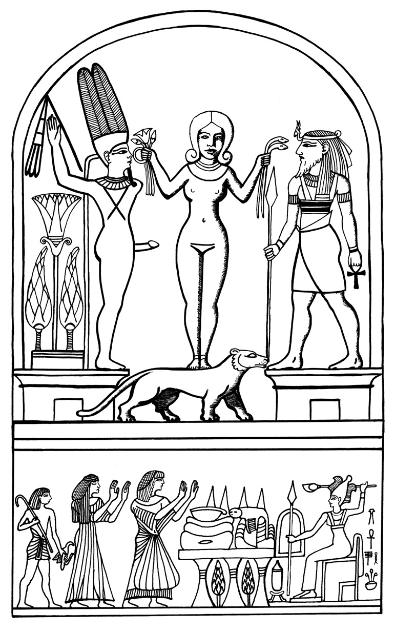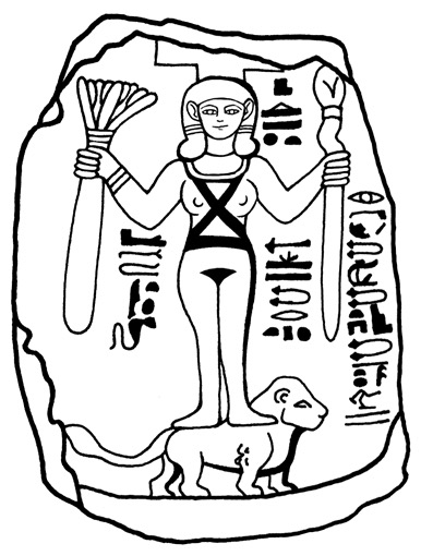 A number of Egyptian relief plaques from this period depict a fully frontally nude goddess[9] usually standing on a lion and sometimes posed between the Canaanite warrior god Reshep(h), an Underworld deity, and the Egyptian fertility god, ithyphallic Min[10] (Cornelius 2004: Plates 5.1-5.18; Binger 1997: 56-58; Pritchard 1969: 163-164 #470-474). The Egyptians called her Qedeshet or Qudshu.