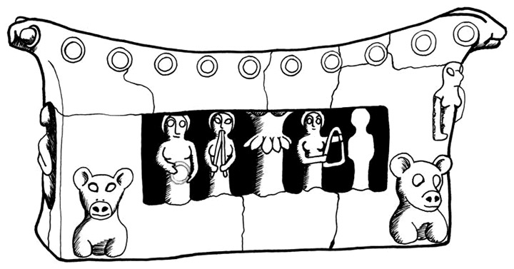 Cult stand with small orchestra or procession. The concave top has three openings. Two lion heads and partial torsos are affixed to the lower edges of the front. A female figure stands above the lion on the right side; likely the left side had a similar figure. The lions and female figures suggest at once that the stand was part of the cult paraphernalia of a temple in which a goddess was worshiped. Above the lions a long opening displays a group what appears to be female musicians, a temple orchestra? The opening has two sections, separated by what looks like a tree (or pillar) with six leaves hanging down. Originally two figures stood on either side of the tree-pillar, but now the one on the far right is missing. The remaining figures are female musicians. The one on the far left seems to be playing a small drum or tambourine. Next to her is a double-flute player. Although somewhat damaged, the third is probably a lyre player. The narrow ends are also decorated: On one side, a female figure holds her breasts, but the figure (?) beside her is now missing.  The opposite side has an opening, containing possibly a pillar, but no figures. Originally the stand was decorated with painted “motifs,” which have now practically disappeared. Clay. 16.6 cm high. Dated about the ninth century BCE. From the Philistine site of Yavneh, Israel. Eretz-Israel Museum, Tel Aviv.