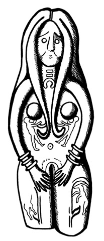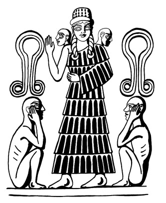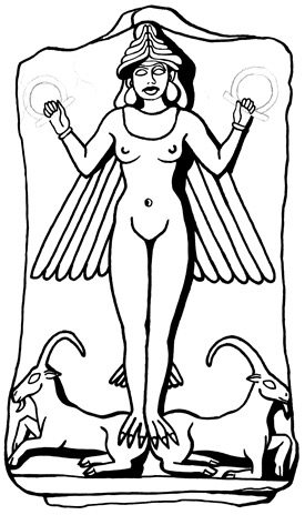 So-called Lilith, but actually Inanna/Ishtar. She wears the multi-horned headdress of a great deity and, by analogy with the better-known but similar “Burney plaque” (Patai 1990: Figure 31), probably held in her hands symbols of power. She has wings and taloned feet and stands between two goat-like animals. Terracotta relief. Dating to about 2000 B.C.E.