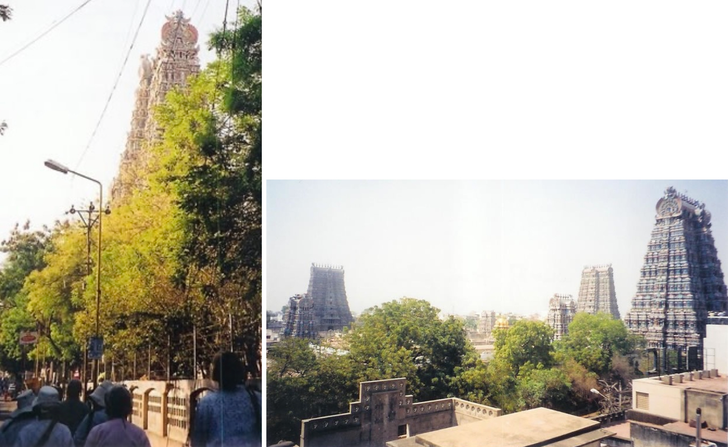 (right) View of temple from the roof of a nearby building. The tallest towers surmount the major gateways. The golden dome tops the tower over the goddess Meenakshi’s shrine.
