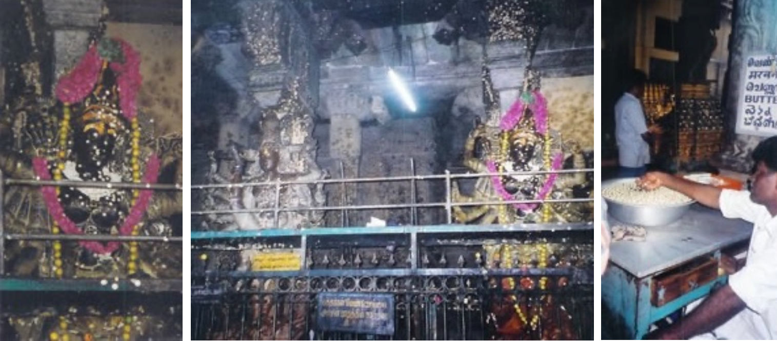 We came across a ritual in progress, the throwing of butter at the sacred couple, Sundareshvara (“Beautiful Lord”) (Harman 1989: 22) and Meenakshi (“Fish-eyed One”), to cool them down.