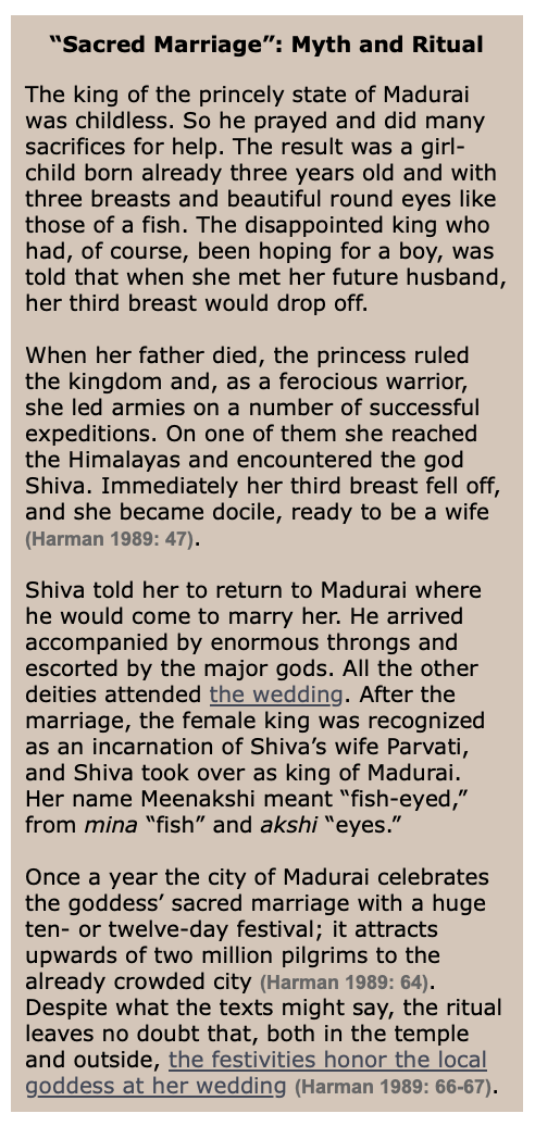 The “Sacred Marriage” of Meenakshi to Shiva (above) brought the powerful local goddess, now identified with Shiva’s consort Parvati, into the mainstream of Hindu religion, but it did not change the worship patterns of the ordinary people of Madurai and elsewhere. They still consider Meenakshi to be the more important deity and worship her first when they come to the temple (Harman 1989: 64-65). If worshipers need Shiva’s help, they ask Meenakshi to intercede with him on their behalf (Harman 1989: 153).